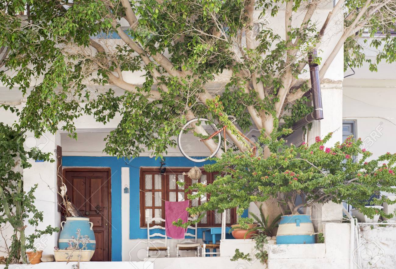 Hausfassade Mit Blumentopfen Stuhlen Und Baum Sommer In Elounda Kreta Griechenland Lizenzfreie Fotos Bilder Und Stock Fotografie Image 80780567
