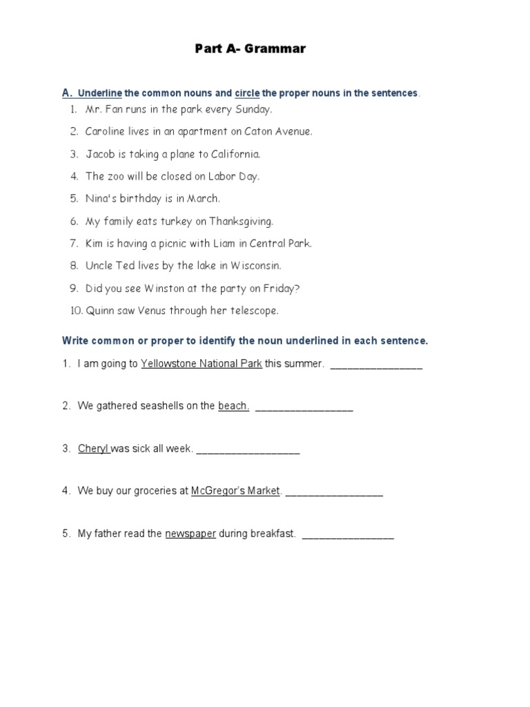 Part A-Grammar: Underline the common nouns and circle the proper nouns in the sentences | Predicate (Grammar) | Syntax